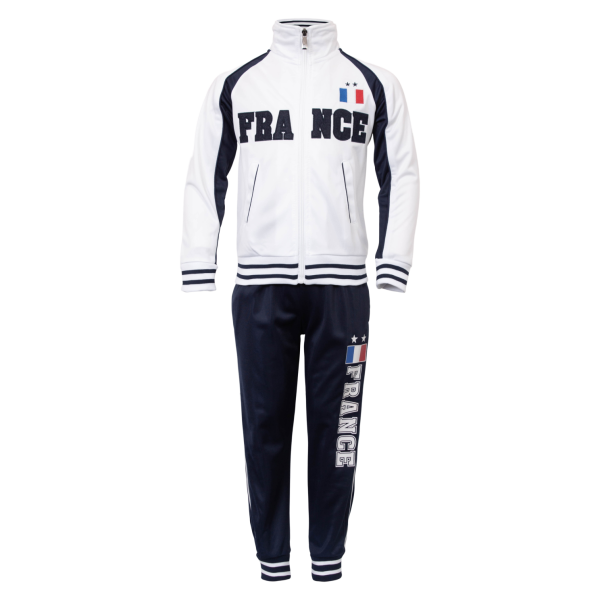 Frankrig joggingsæt til børn. France påtrykt både på for- og bagside af trøjen samt langs det ene bukseben. Trøjen har lynlås, to sidelommer og høj krave. Bukserne har lommer og elastisk talje med indvendig snøre..