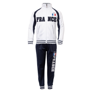 Frankrig joggingsæt til børn. France påtrykt både på for- og bagside af trøjen samt langs det ene bukseben. Trøjen har lynlås, to sidelommer og høj krave. Bukserne har lommer og elastisk talje med indvendig snøre..