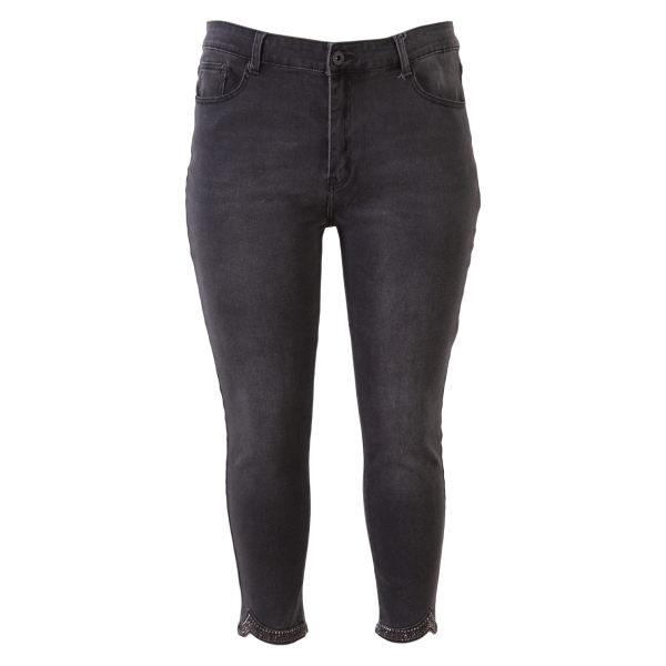 BS plus size jeans i 7/8 længde med sten forneden. Bukserne har fem lommer, bæltestropper samt knap- og lynlåslukning. Buksen har masser af stretch..