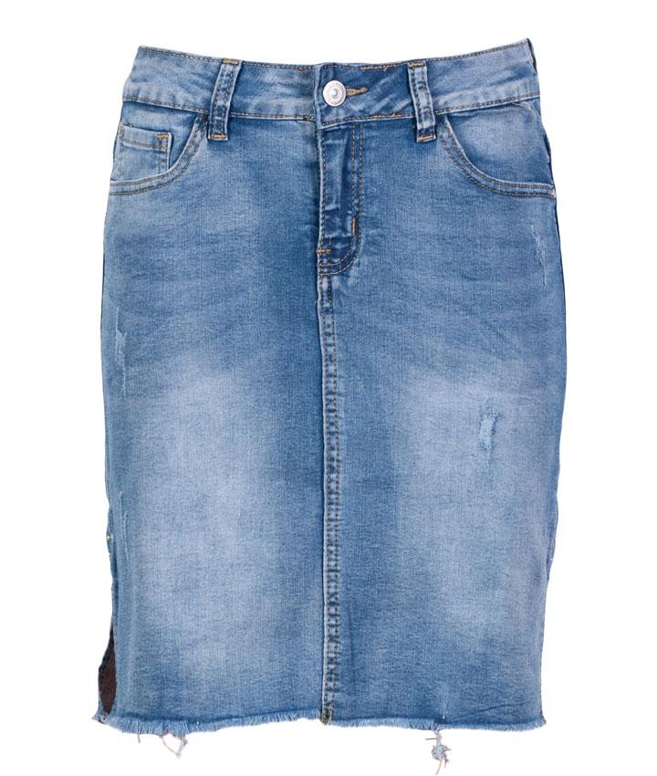 BS denim nederdel. Nederdel med slidser i begge sider og rå kant. Nederdelen har bæltestopper i linningen, lynlåslukning og masser af stretch..