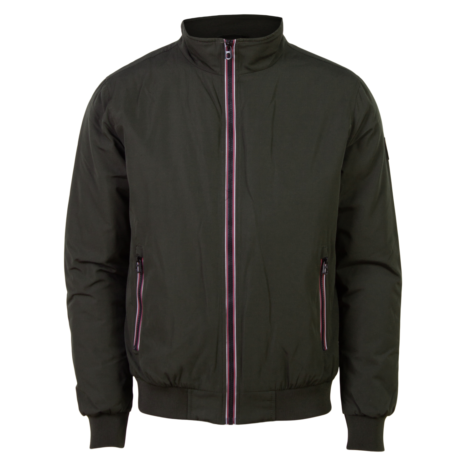 Herre jakke i ensfarvet grøn med røde og hvide detaljer rundt om lynlås. Jakken har 2 lommer samt ribbed elastikkant i talje og ærmer, for en god pasform..