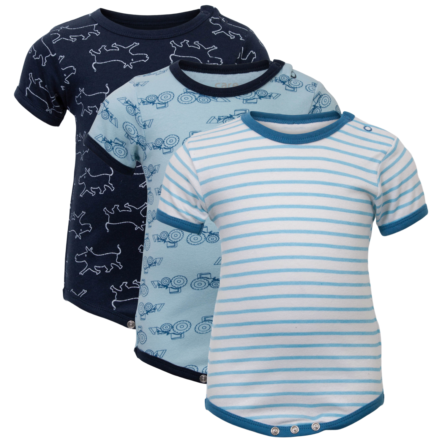 3-pak body med korte ærmer og forskellige all-over prints. Bodyen har trykknapper mellem benene og ved den ene skulder..