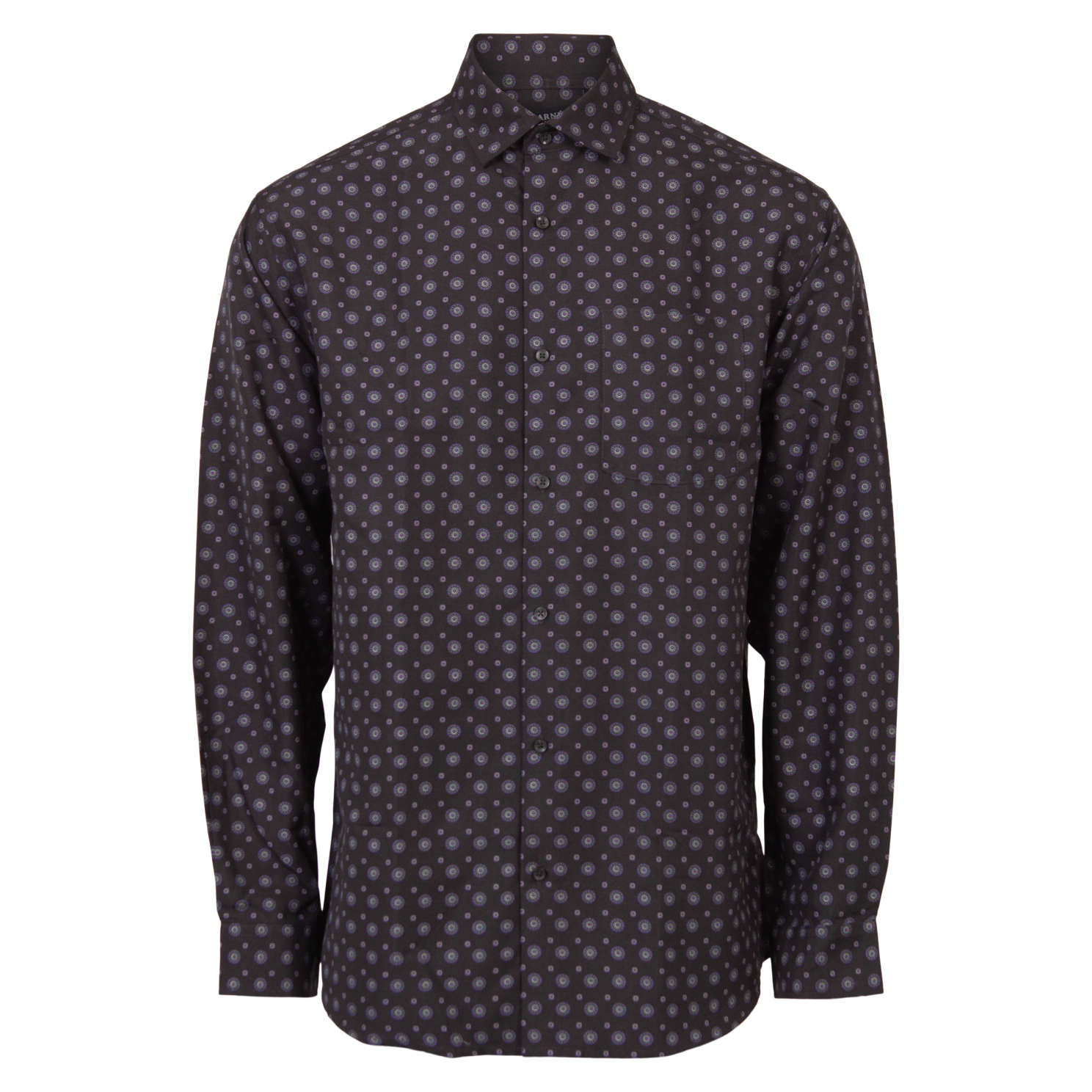 – Mønstret langærmet skjorte- Gennemgående knaplukning- All-over print- Brystlomme – Spread-krave- Normal fit- Plus size.
