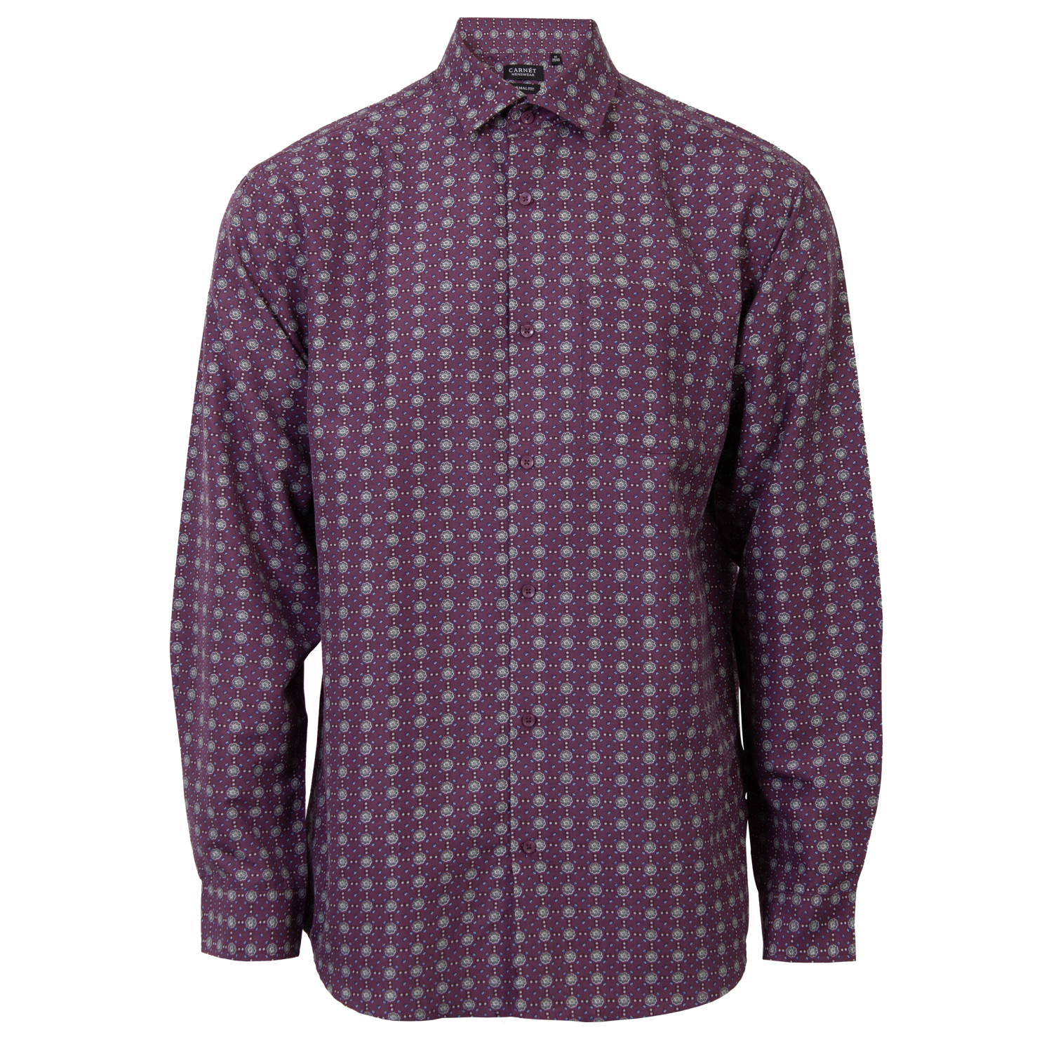 – Mønstret langærmet skjorte- Gennemgående knaplukning- All-over print- Brystlomme – Spread-krave- Normal fit- Plus size.