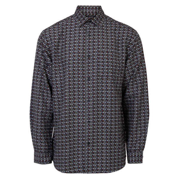 – Mønstret langærmet skjorte- Gennemgående knaplukning- All-over print- Brystlomme – Spread-krave- Normal fit- Plus size.