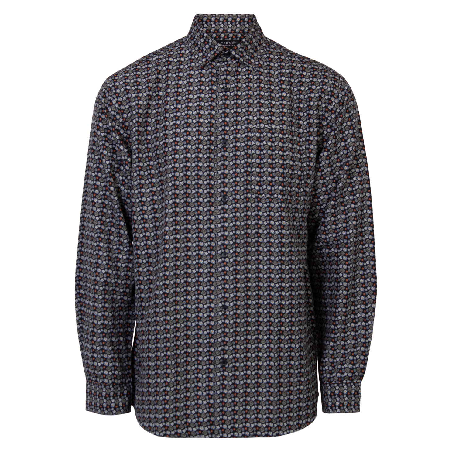 – Mønstret langærmet skjorte- Gennemgående knaplukning- All-over print- Brystlomme – Spread-krave- Normal fit.