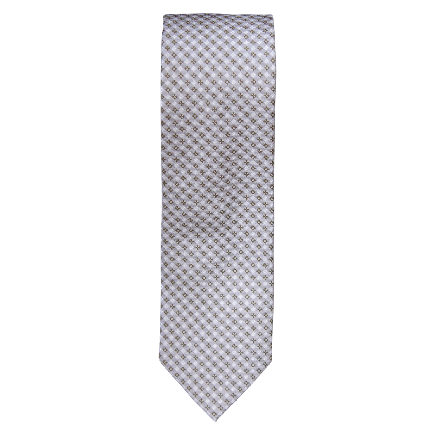 Klassisk slips i grå med firkantet design i farverne grøn, hvid og grå..