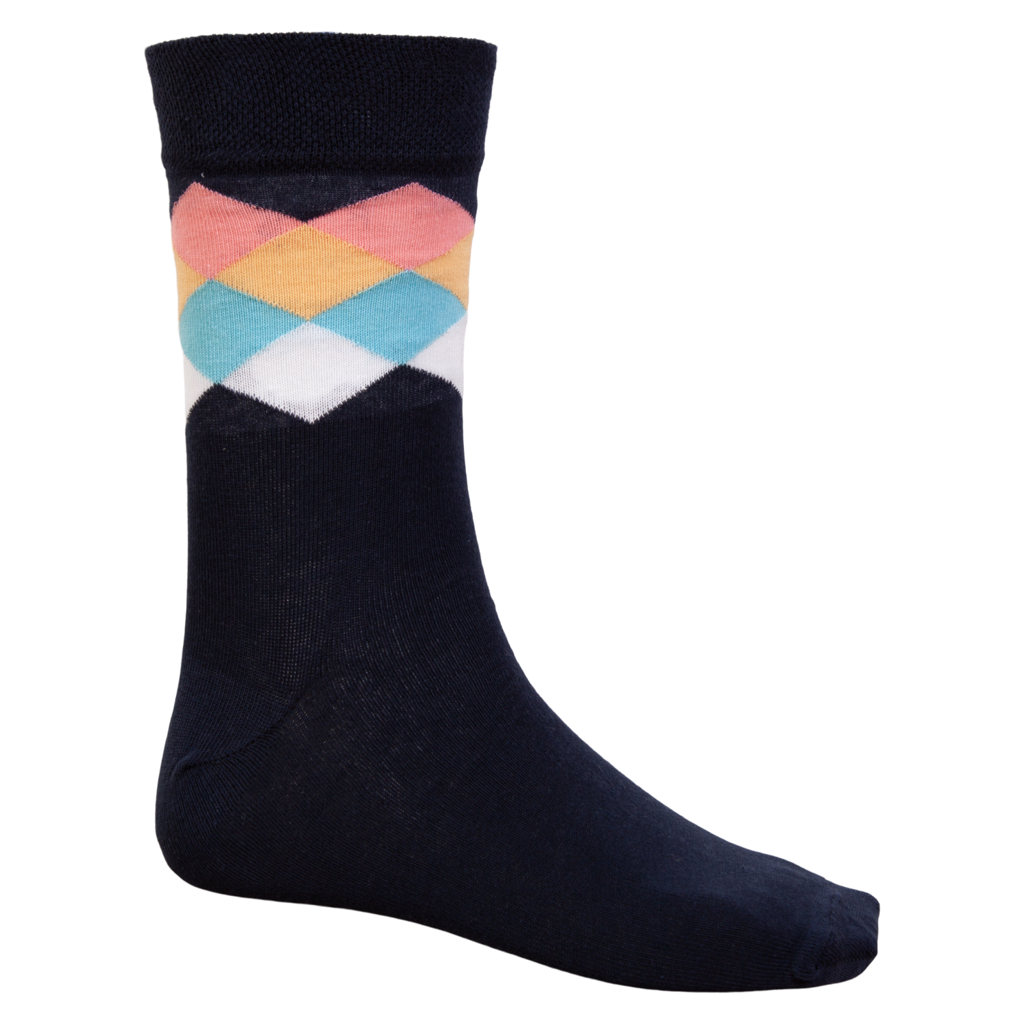 Klassiske herre strømper i ensfarvet navy blå med firkantet mønster i farverne lyserød, orange, blå og hvid..