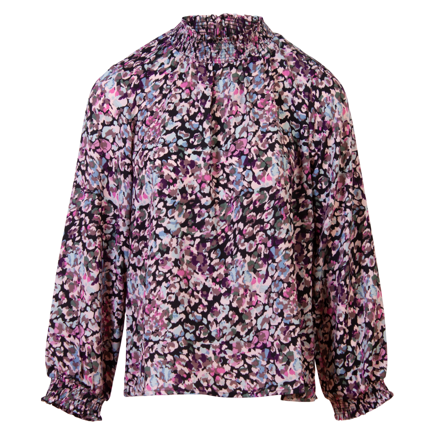 Langærmet dame bluse i all-over print. Blusen har smok detalje ved ærmer samt hals som lukkes i nakken med to knapper..