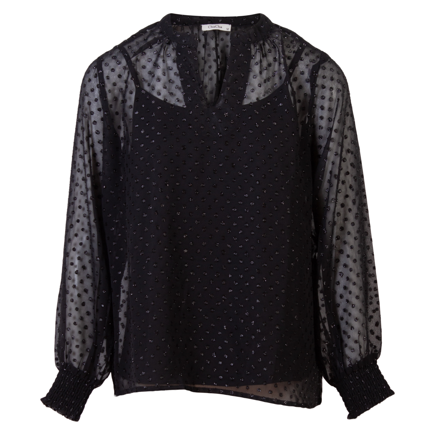 ChaCha chiffon bluse med glitter effekt, V-hals udskæring samt lange ærmer med smok. Blusen har en aftagelig top under..