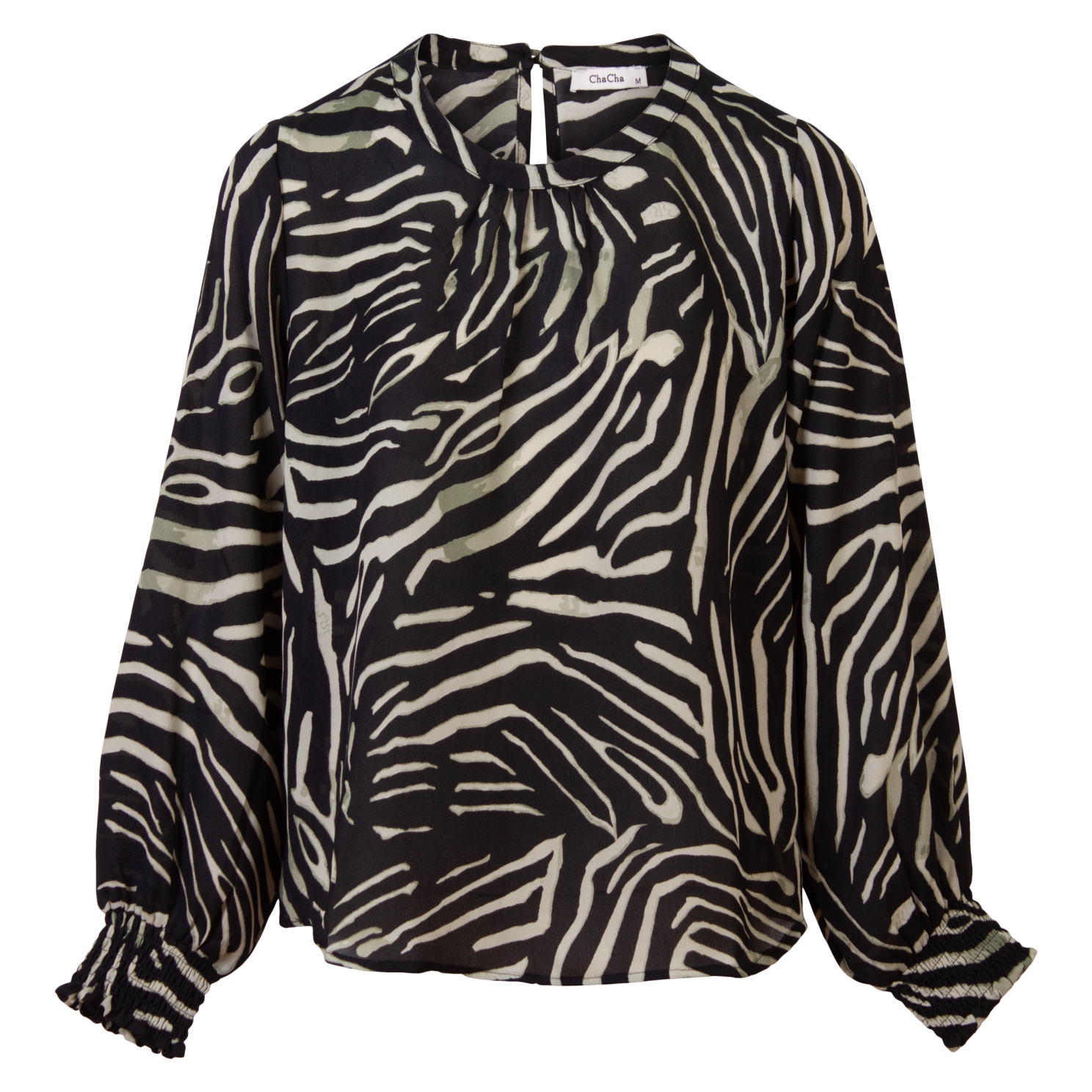 Langærmet dame bluse i all-over print. Blusen har smok i ærmet samt rund halsudskæring og lukkes i nakken med en lille knap..