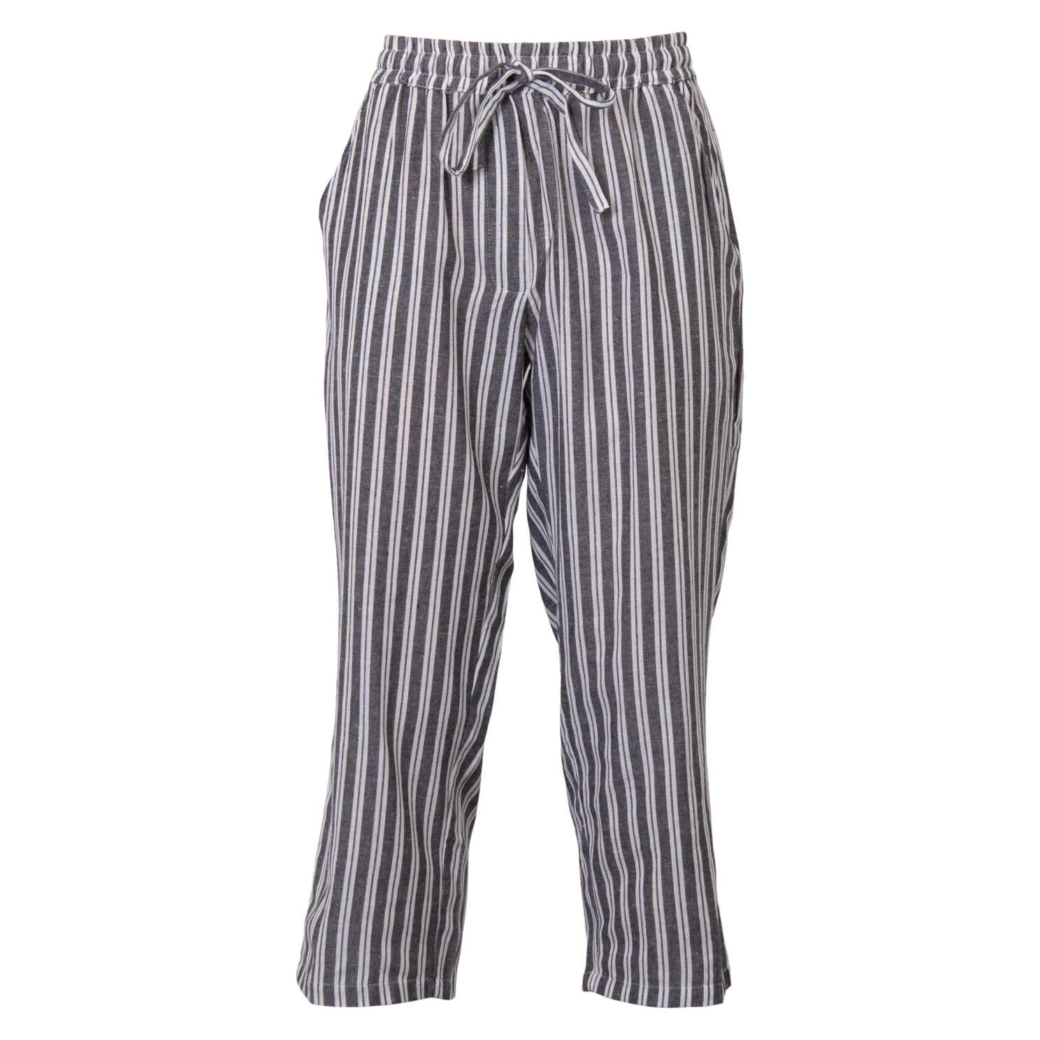 Lette og luftige capri bukser i stribet design. Bukserne er med elastik og snøre i taljen, sidelommer samt én baglomme..