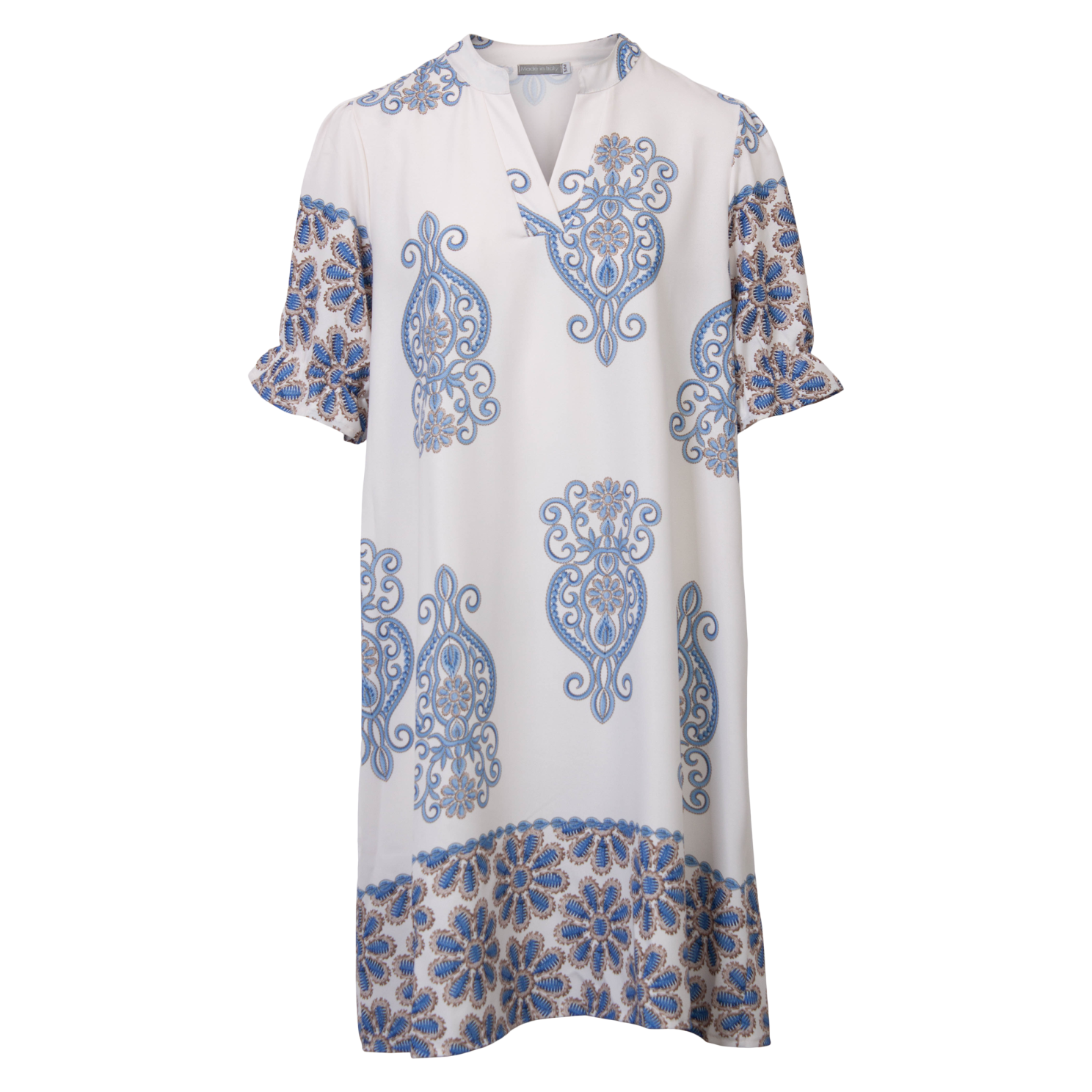 Dame kjole med korte ærmer. Kjolen har et flot print og en tynd elastik i ærmekanten, som giver en fin rynkeeffekt. Kjolen er lidt længere bagpå..