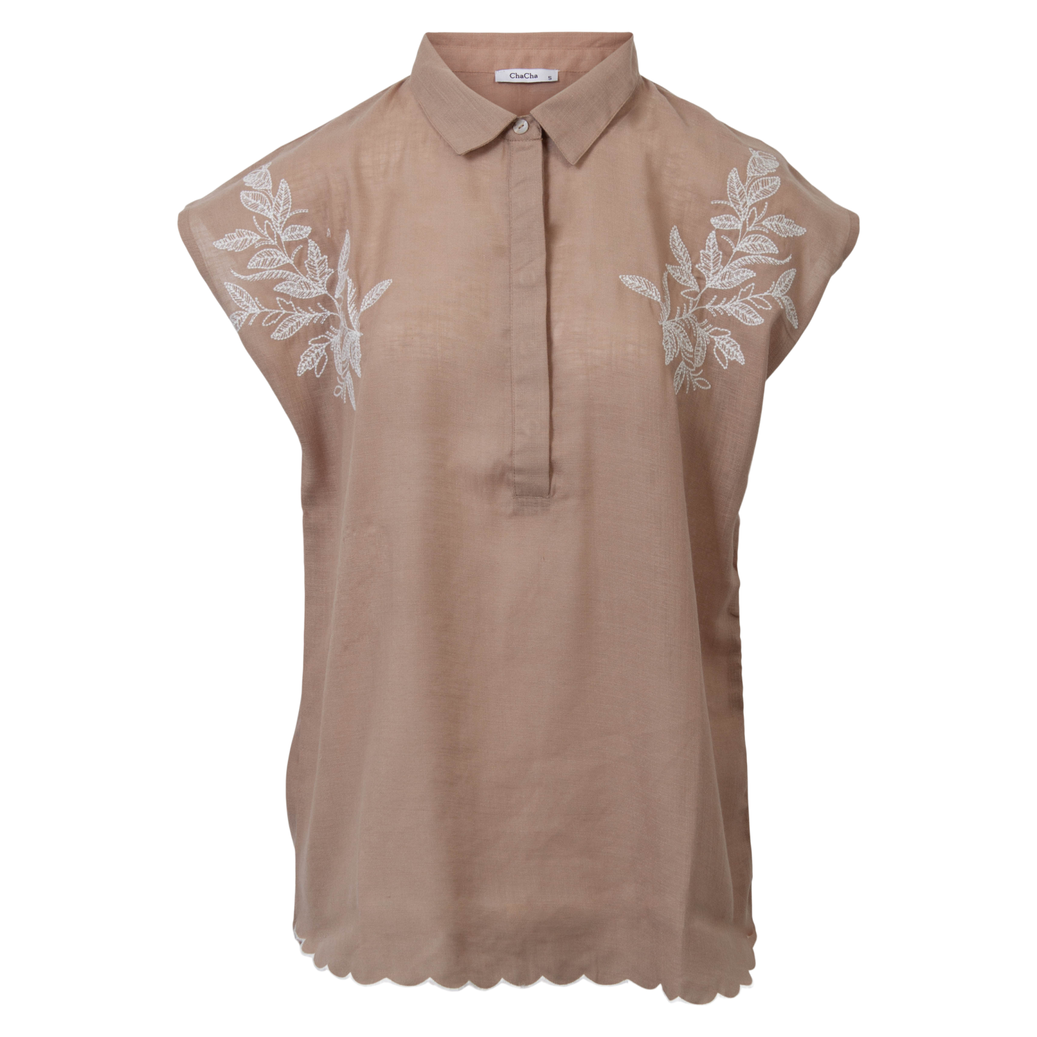 Cha Cha dame bluse uden ærmer. Toppen har stolpelukning og krave, samt fine broderede detaljer på fronten og ved taljen..