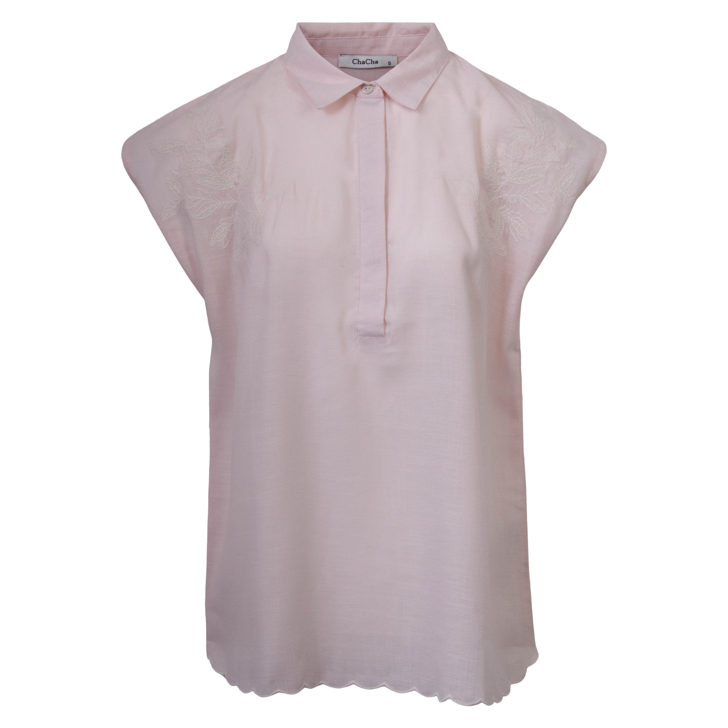 Cha Cha dame bluse uden ærmer. Toppen har stolpelukning og krave, samt fine broderede detaljer på fronten og ved taljen..