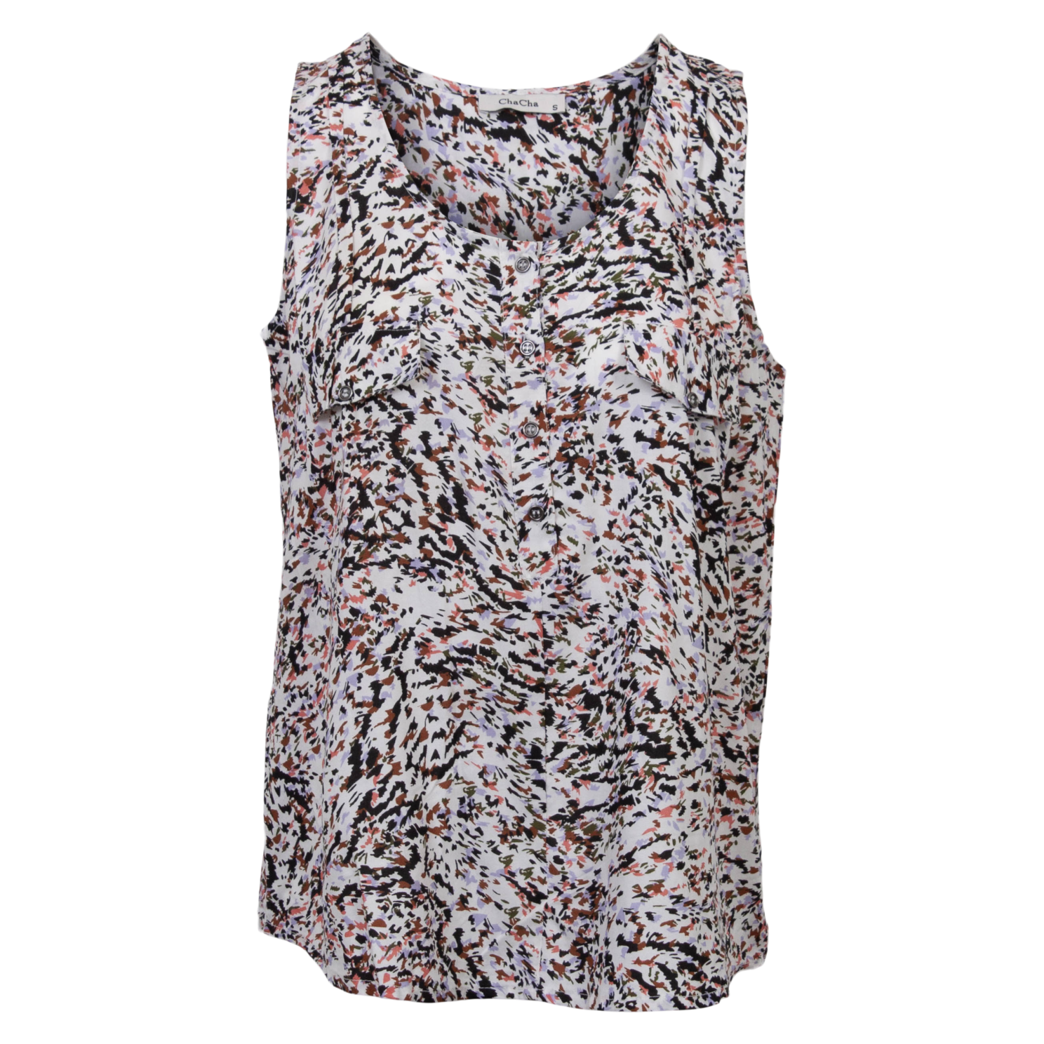 Cha Cha dame top. Smart top med brede stropper. Toppen har pyntelommer på brystet, samt knappelukning ved den runde halsudskæring..