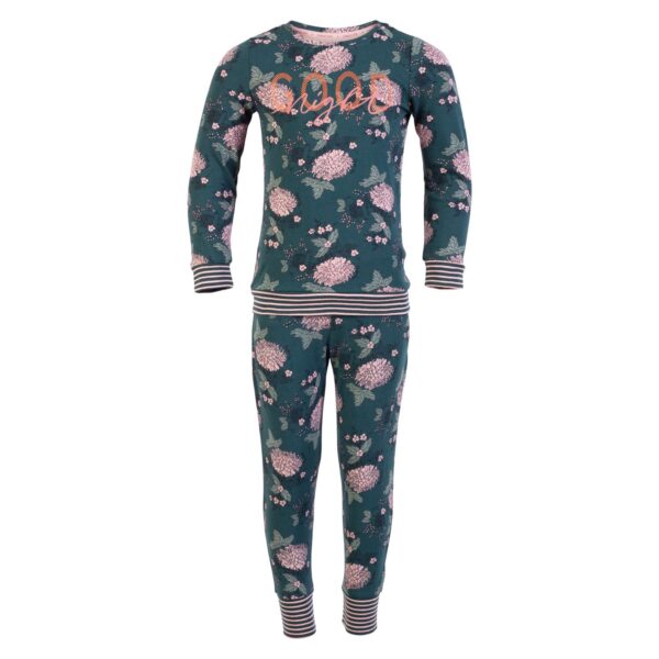 Charlie Choe pige nattøjssæt.Super fint todelt nattøjssæt bestående af en langærmet bluse og et par lange bukser, begge dele med blomstret print. Blusen har rund halsudskæring og ribkant i ærmer og bunden. Bukserne er lange og har ribkant i buksebenene sa.