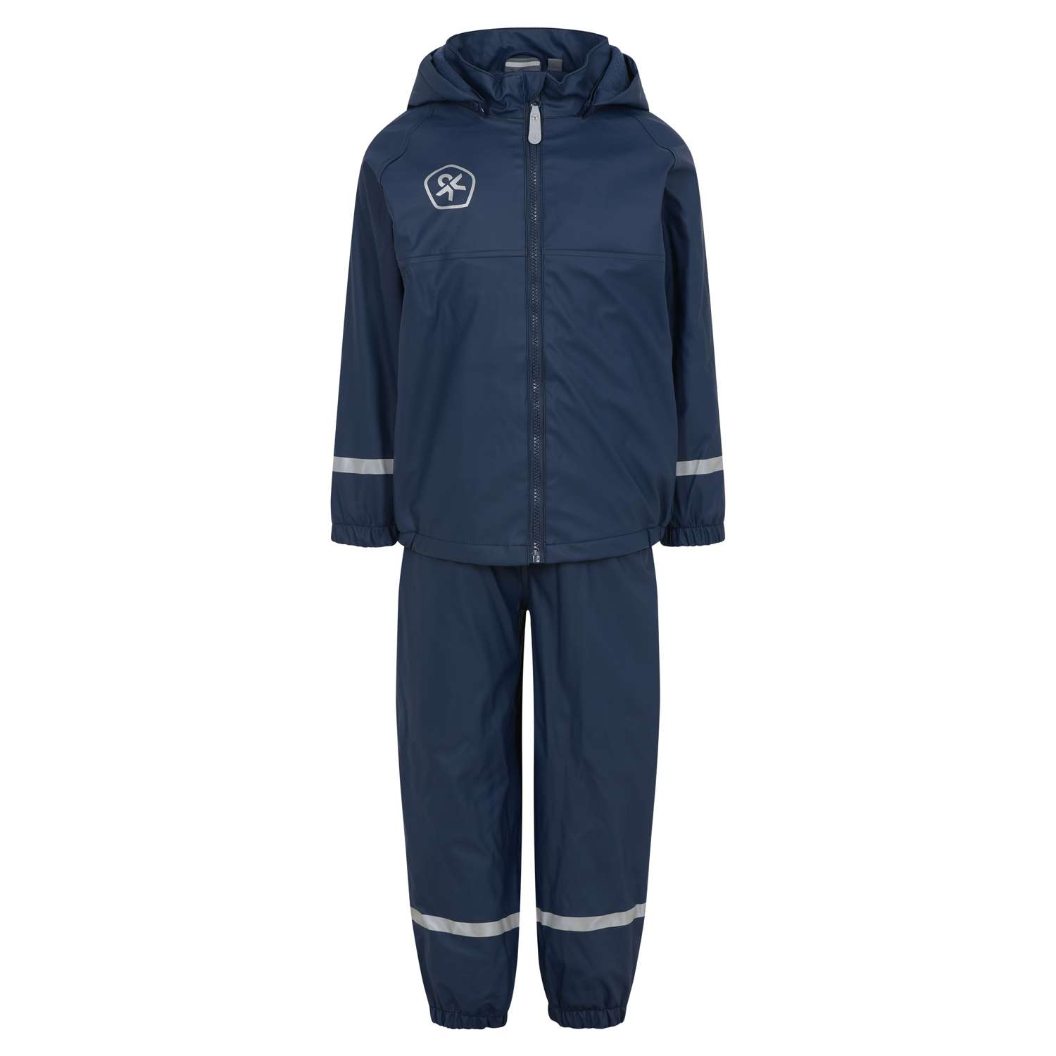 Color Kids børne regntøj sæt med for.Todelt regnsæt bestående af en regnjakke og et par regnbukser, begge med for på indersiden så sættet er varmere end normalt regntøj. Regnjakken har aftagelig hætte, lynlåslukning og logo af refleks på højre bryst og læ.