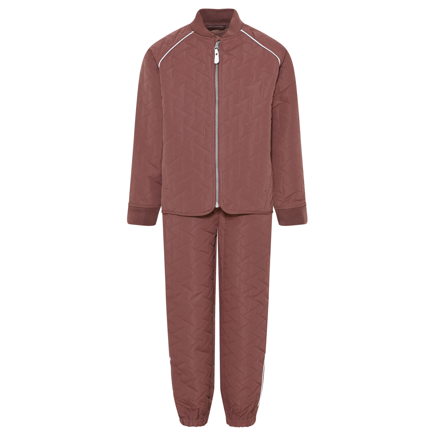 Color Kids termosæt med quiltet struktur af trekanter. Termojakken har lynlåslukning med indvendig vindstopper, blød ribkrave, hagebeskytter samt ribkant ved håndleddet. Derudover har jakken reflekser ved skulderen og to store åbne lommer. Bukserne har e.