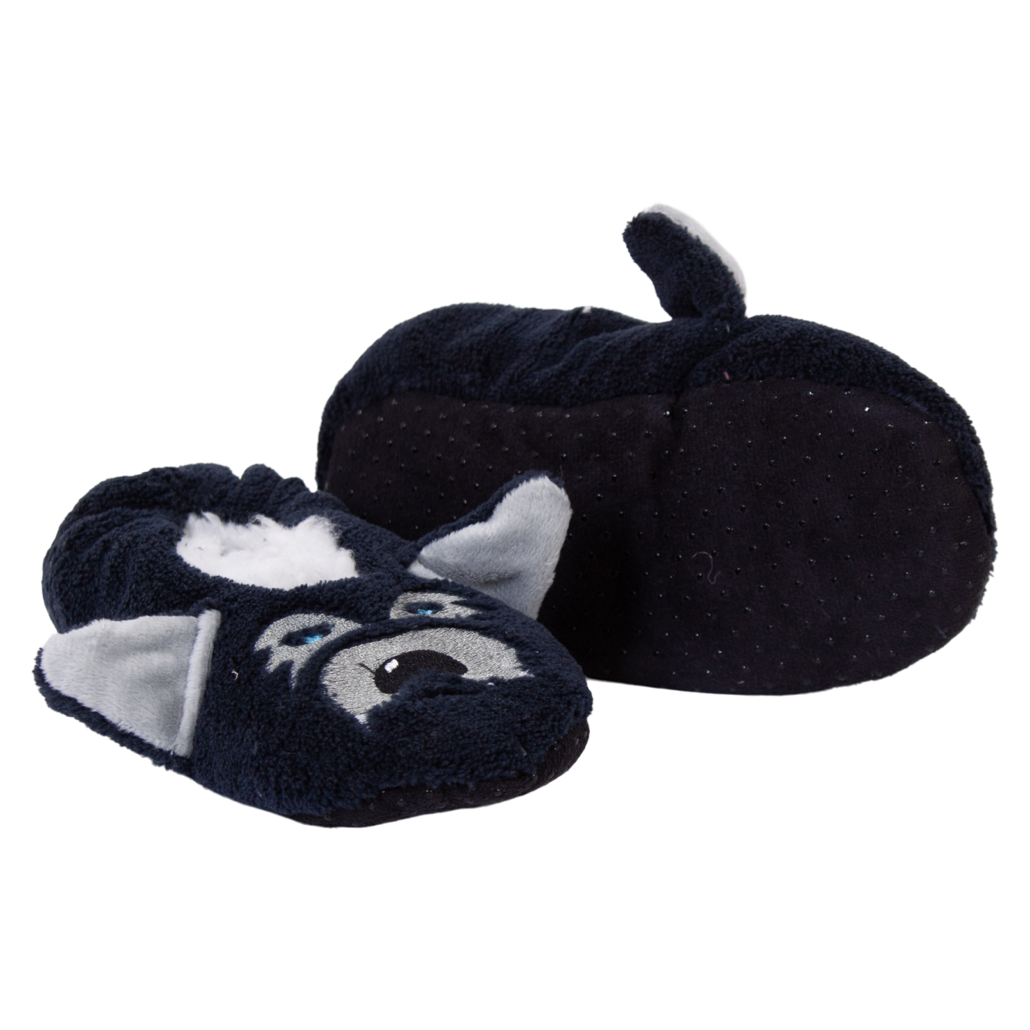 Hjemmesko med ulve-look. Dejligt bløde hjemmesko med blødt for på indersiden og ydersiden. Hjemmeskoene er lige til at tage på og bliver på foden. Skridsikker bund..