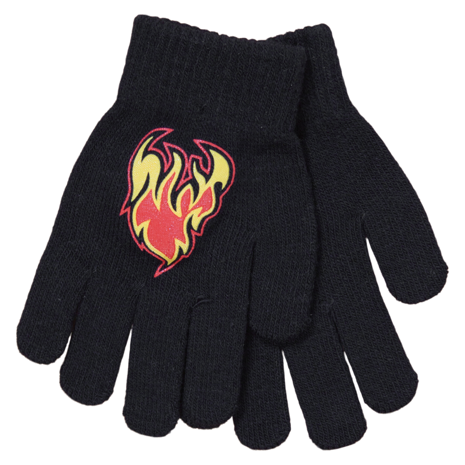 Crossbow strikvanter. Fint strikkede fingervanter med ribkant ved håndleddet og med print af flammer i på håndryggen..