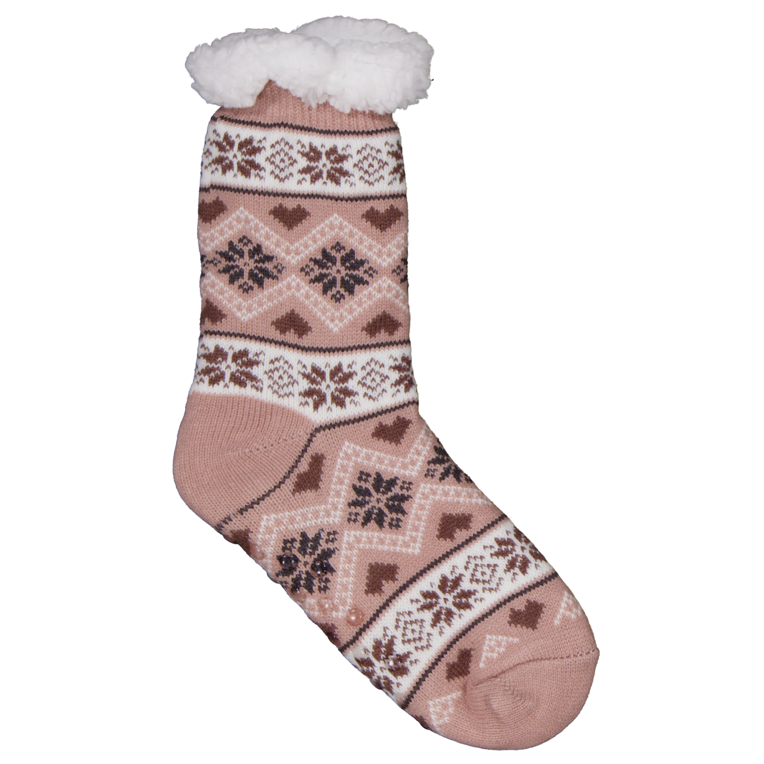 Bløde dame strømper med julemotiv. Strømperne har skridsikker gummi dutter under bunden og et langt skaft op ad benet..