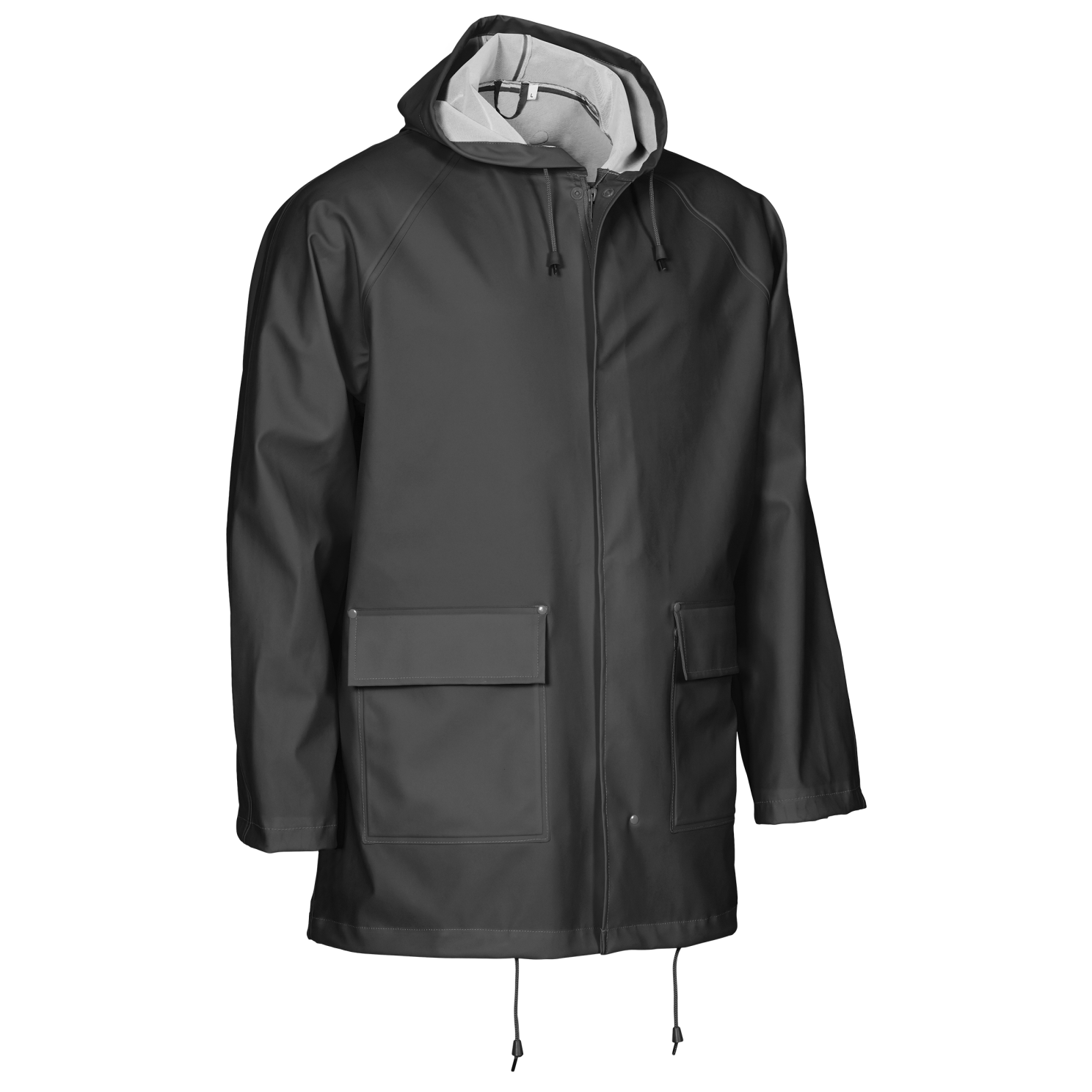 Elka regnjakke i moderne pasform, der kombinerer komfort fra hverdagstøj med praktikken i professionelt arbejdstøj. Regnjakken har lynlås, vindfang med trykknapper, hætte med snøretræk, trykknap i ærmer, forstærkede svejsninger på udsatte steder, rygudluf.