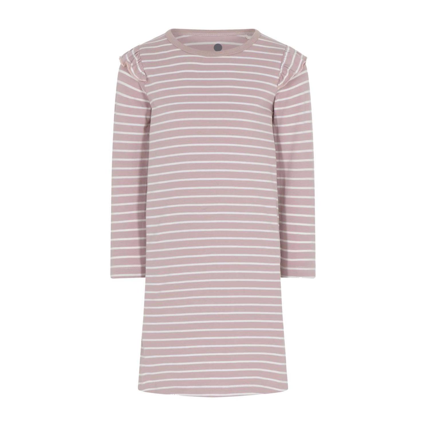En Fant pige kjole med økologisk bomuld. Fin kjole med lange ærmer, rund halsudskæring og vandrette striber. På skuldrene er der de fineste flæser og kjoler er skåret i A-snit, hvor den fra armhulen og ned svajer en smule udad..