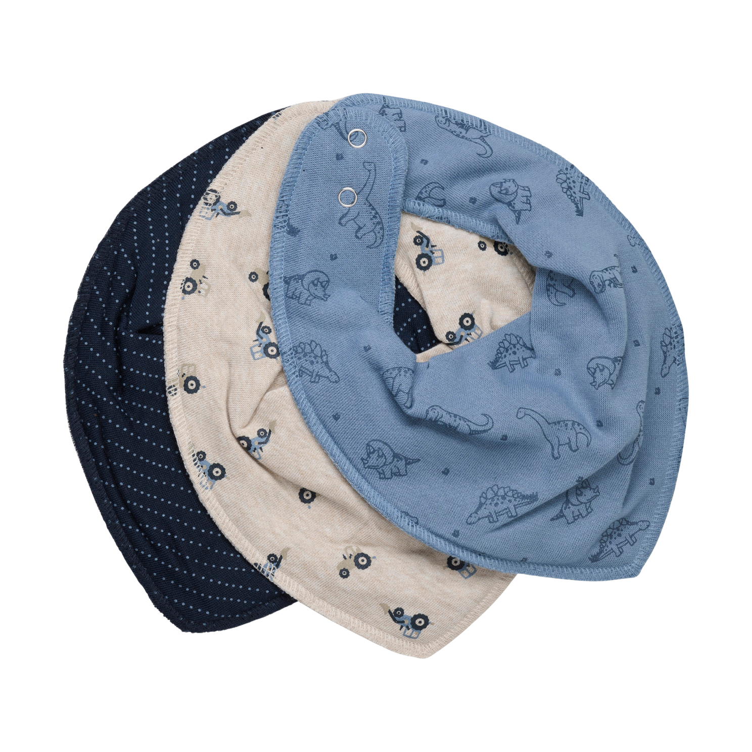 3-pack savlesmække i 3 forskellige farver/print. savlesmækkene har en spids form, og lukkes i nakken ved hjælp af tryknap med to indstillinger..
