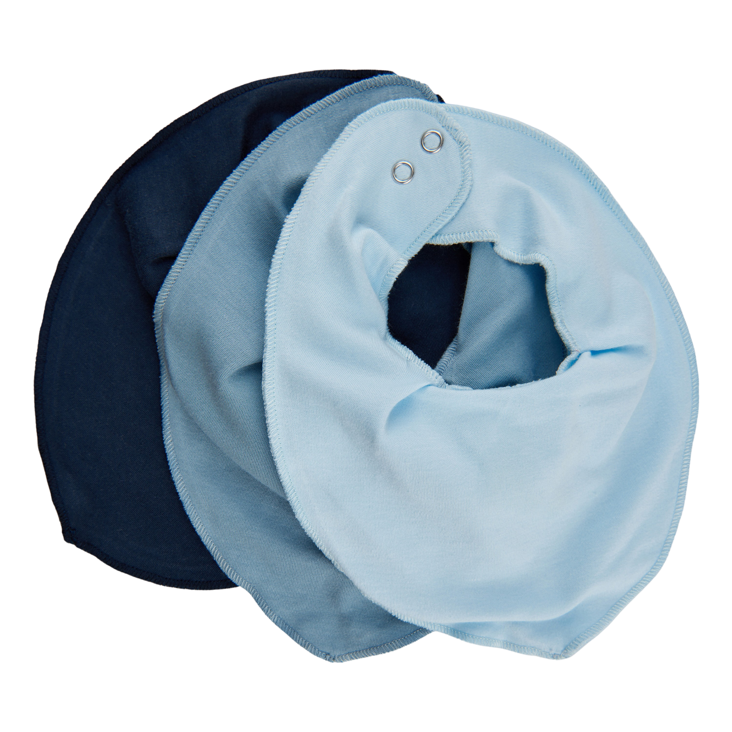 3-pack savlesmække i 3 forskellige farver. savlesmækkene har en spids form, og lukkes i nakken ved hjælp af tryknap med to indstillinger..