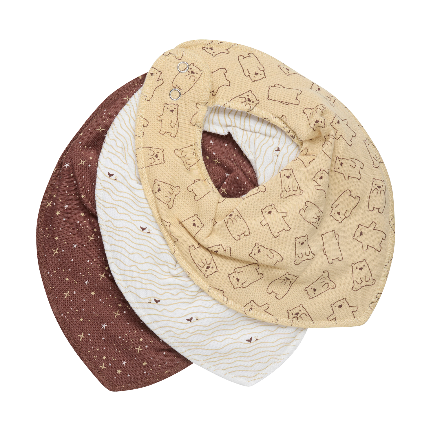 3-pack savlesmække i 3 forskellige farver. savlesmækkene har en spids form, og lukkes i nakken ved hjælp af tryknap med to indstillinger..