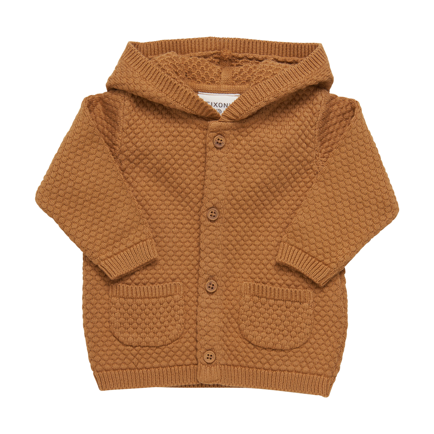 Strikket cardigan lavet i økologisk bomuld, som er GOTS-certificeret. Cardiganen har lommer foran, knaplukning samt en hætte med ører..