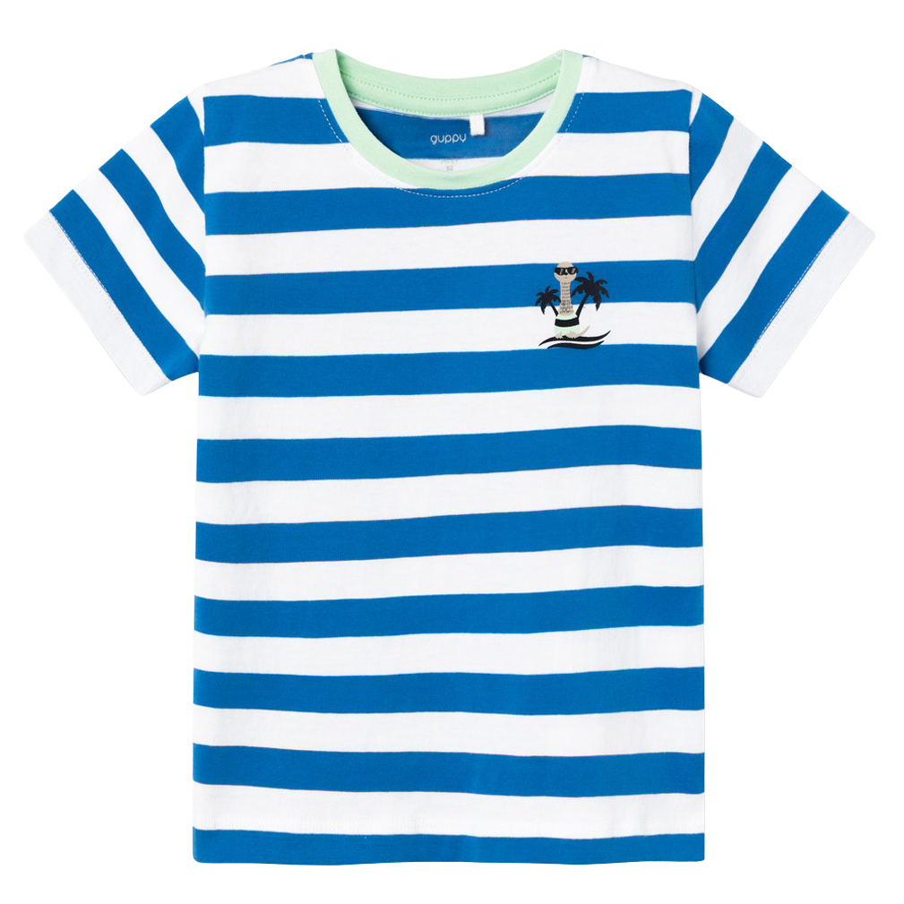 Kortærmet t-shirt i stribet design. Trøjen har blå og hvide striber, grøn halsudskæring samt print på det ene bryst..