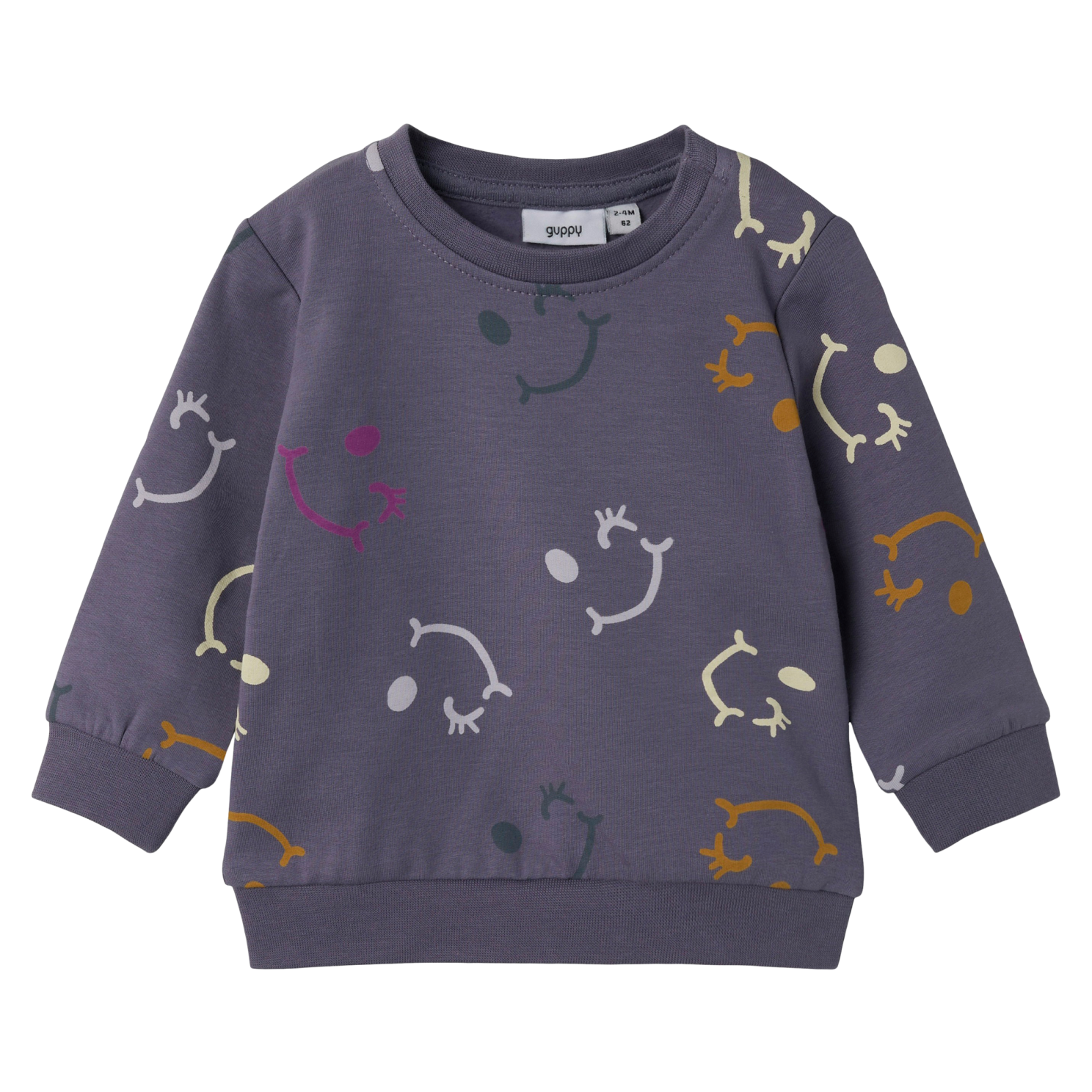 Guppy pige trøje, med flot print, i en dejlig blød kvalitet til de små. Enkel og trendy bluse med en praktisk knappelukning på skulderen, som gør påklædningen lettere. Trøjen er langærmet og har rund halsåbning med en smal ribkant. Ved taljen og ved håndl.