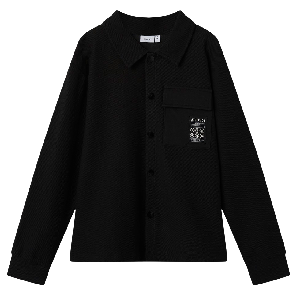 Guppy trøje i ribstof. Trøjen har en lomme på brystet med et label på, og en knappelukning langs trøjen. Skjorten har en krave, som kan lukkes med en knap. Skjortetrøjen har et tykt elastikbånd i rib omkring håndleddene..