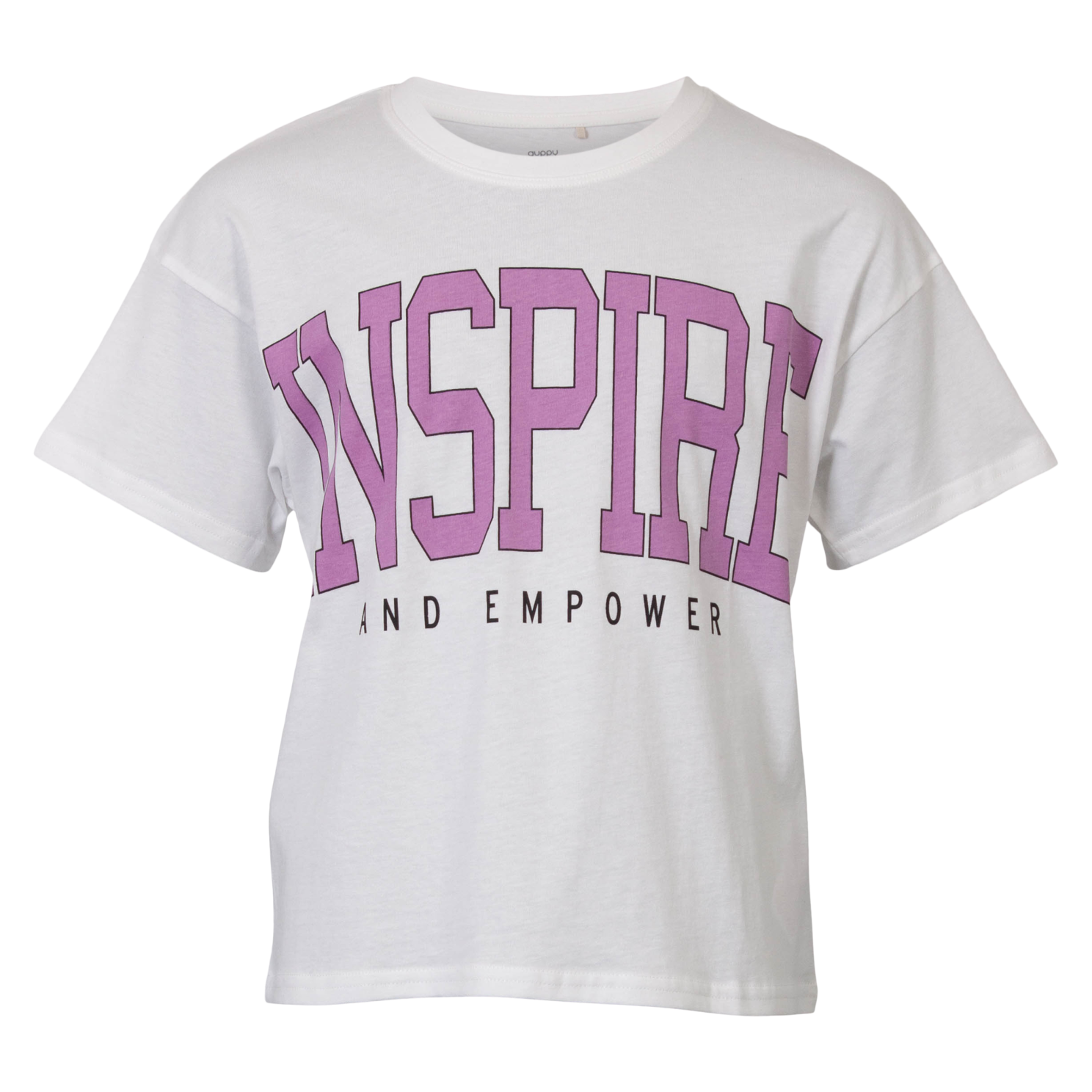 Loose top til tweens med korte ærmer, rund hals og inspire and empower tryk på fronten..