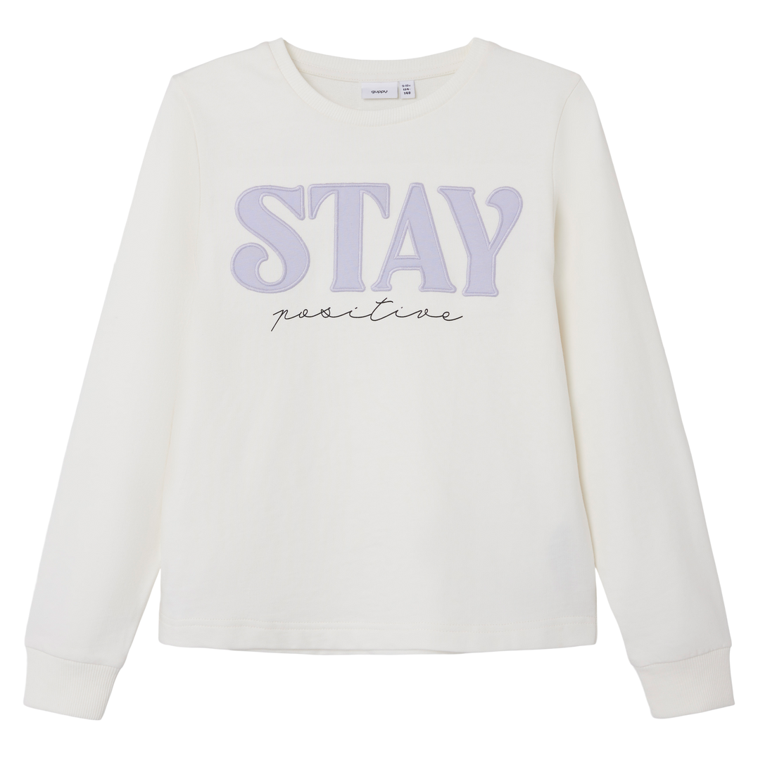 Let trøje i bomuld til tweens med ribkant ved hals og ærmer samt stay positive tekst på brystet..