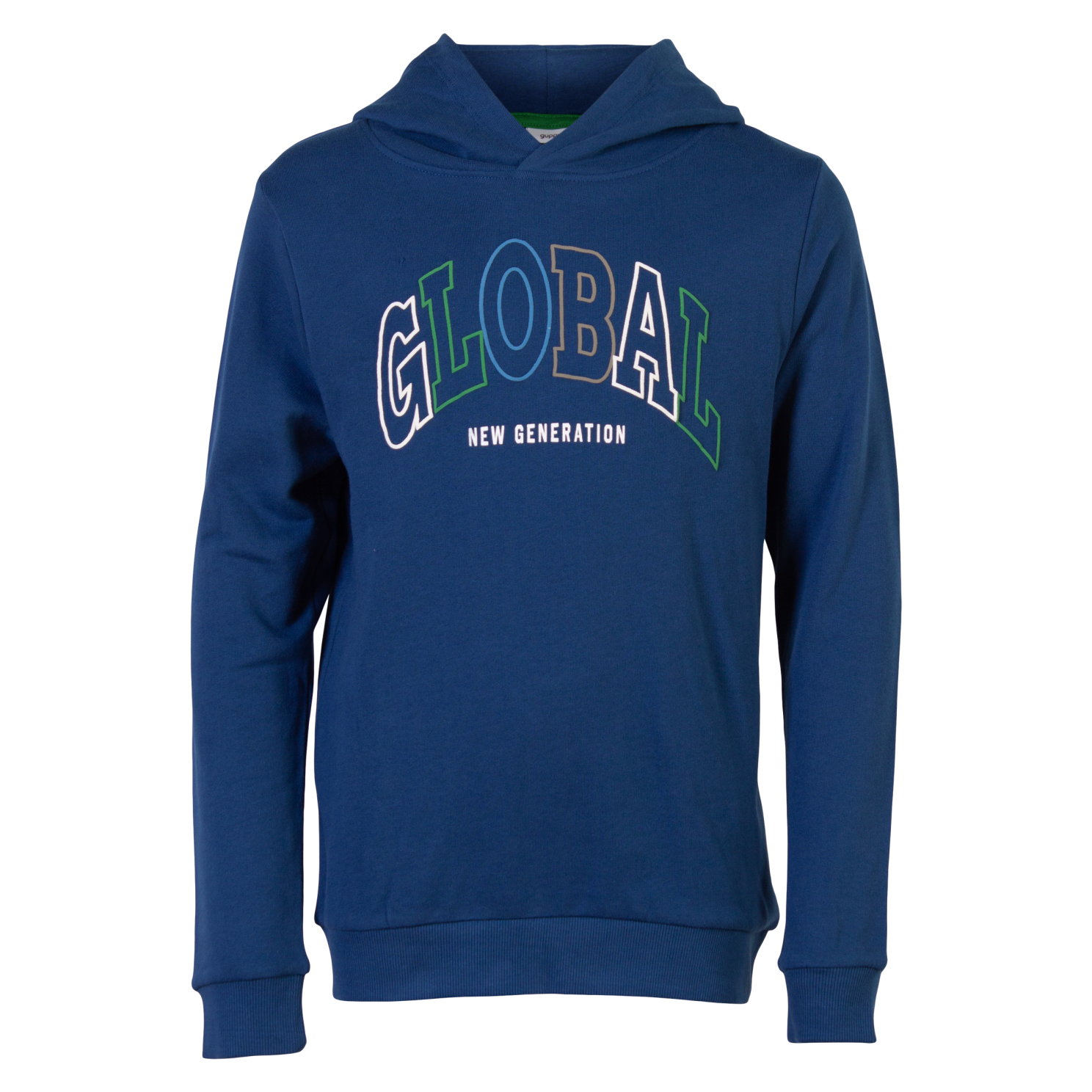 Hættetrøje i blå med tekst på front..