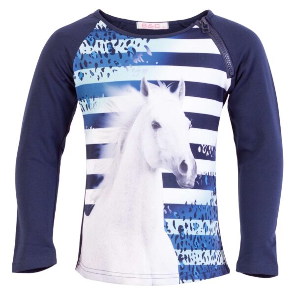 Happy Star pige bluse.Langærmet T-shirt med hesteprint foran. Blusen har en kort lynlås i venstre side ved den runde halsudskæring..