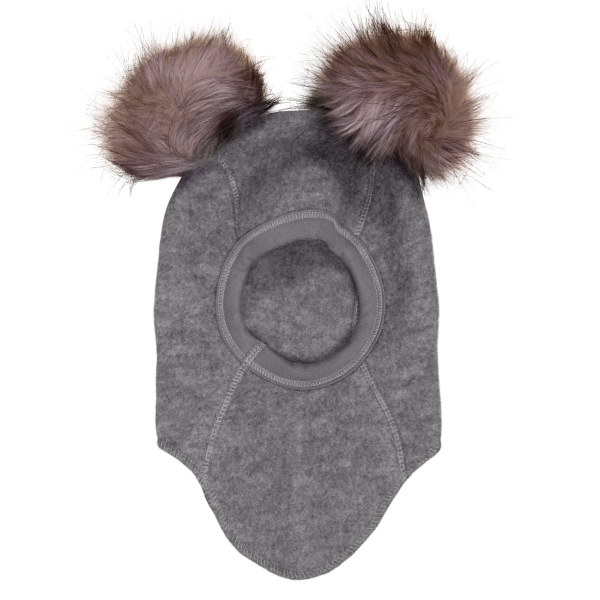 Elefanthue i merino uldkvalitet med ribkant omkring hoved åbningen. Huen har to bløde pom poms på toppen..