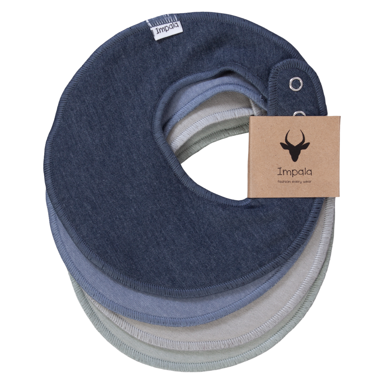 Impala Petit rund hagesmæk 4-pakFire forskellige farvede hagesmække med to justeringsmuligheder via trykknap..