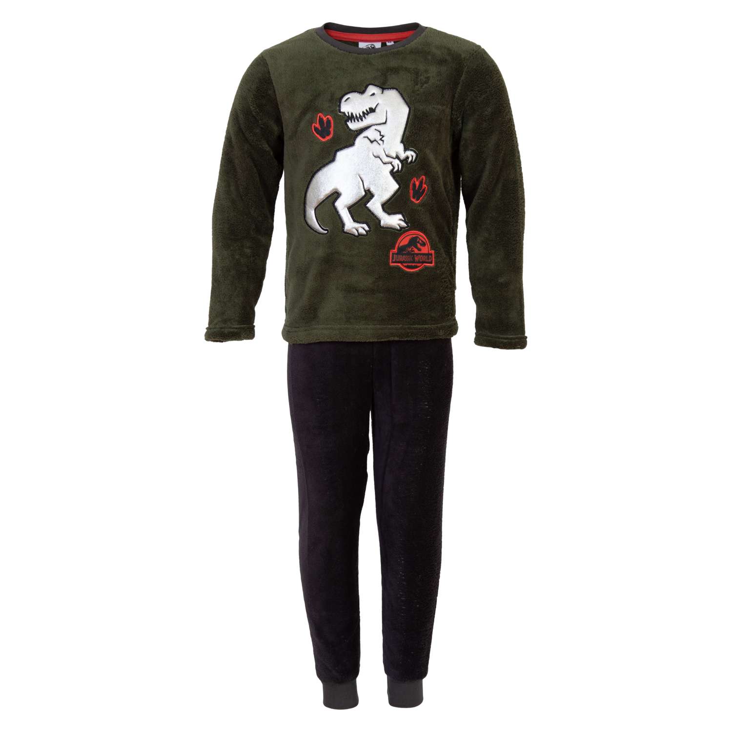 Jurassic World drenge fleecesæt.Fleecetøjet er blødt og behageligt at have på. Trøjen har rund halsudskæring med en lille ribkant om halsen. Buskerne har elastik i taljen, som gør at bukserne tilpasser sig om livet. Bukserne har en ribkant i bunden af ben.