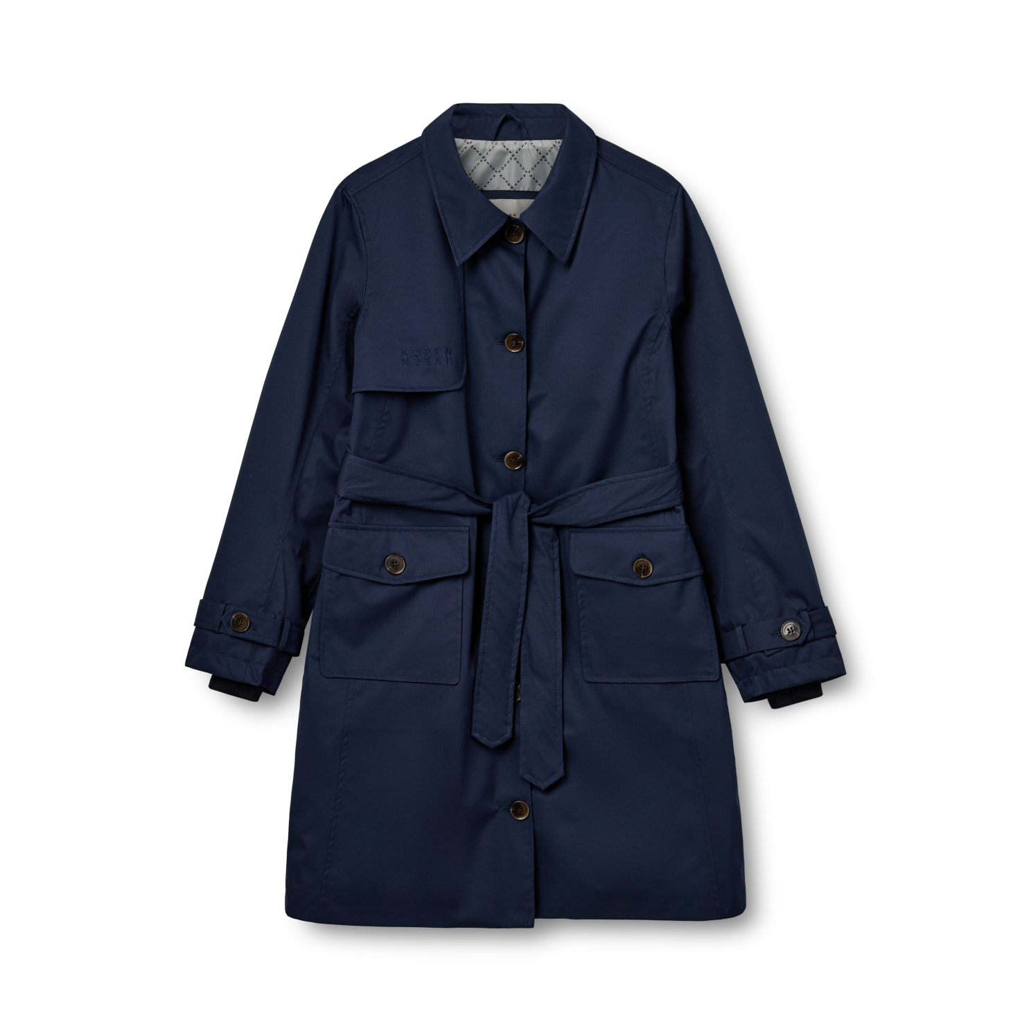 Trenchcoat med 4-ways stretch, knaplukning, bindebånd i taljen, to store lommer foran samt knapper ved håndleddet..