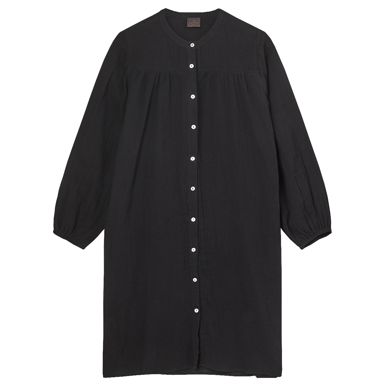 Kopenhaken Varece dame skjortekjole. Skjortekjolen har rund hals. Kjolen har elastikkant i ærmerne og gennemknappet. Kvaliteten er dobbelt lag gaze i bomuld..