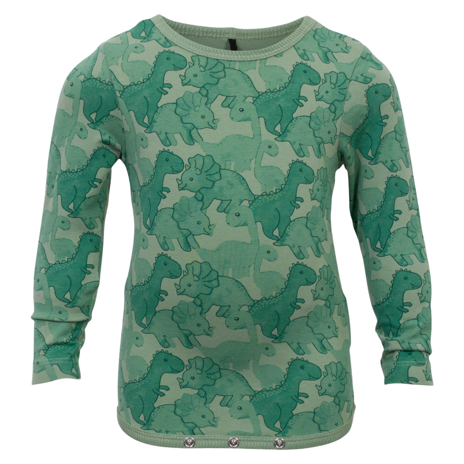 Me Too body med dinosaur print. Bodyen har lange ærmer og denne bodystocking har trykknapper ved halsåbningen for nem af – og påklædning, samt 3 trykknapper ved skridtet, så det er let at skifte ble..