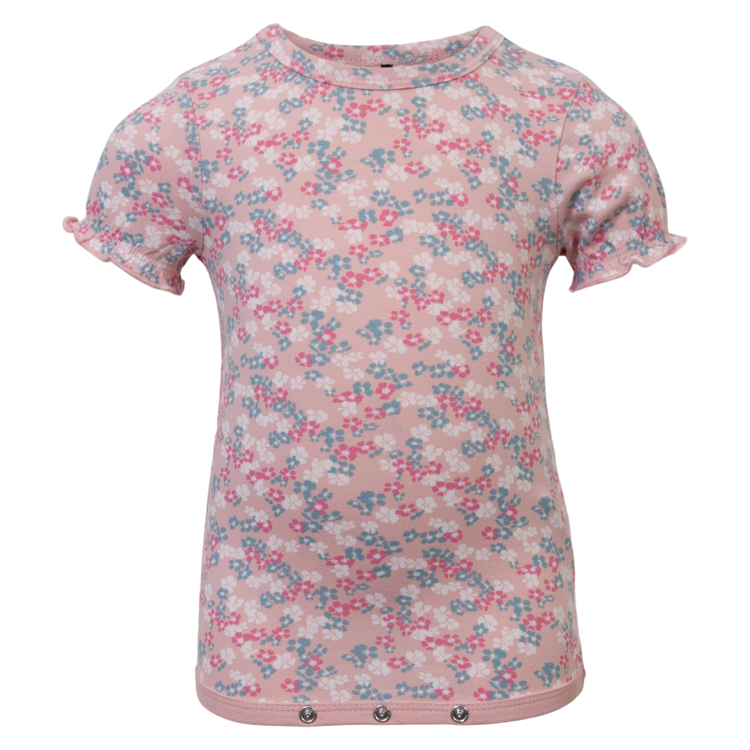Baby body med all-over mønster og korte ærmer med flæser. Bodyen har trykknapper ved halsåbningen og mellem benene..