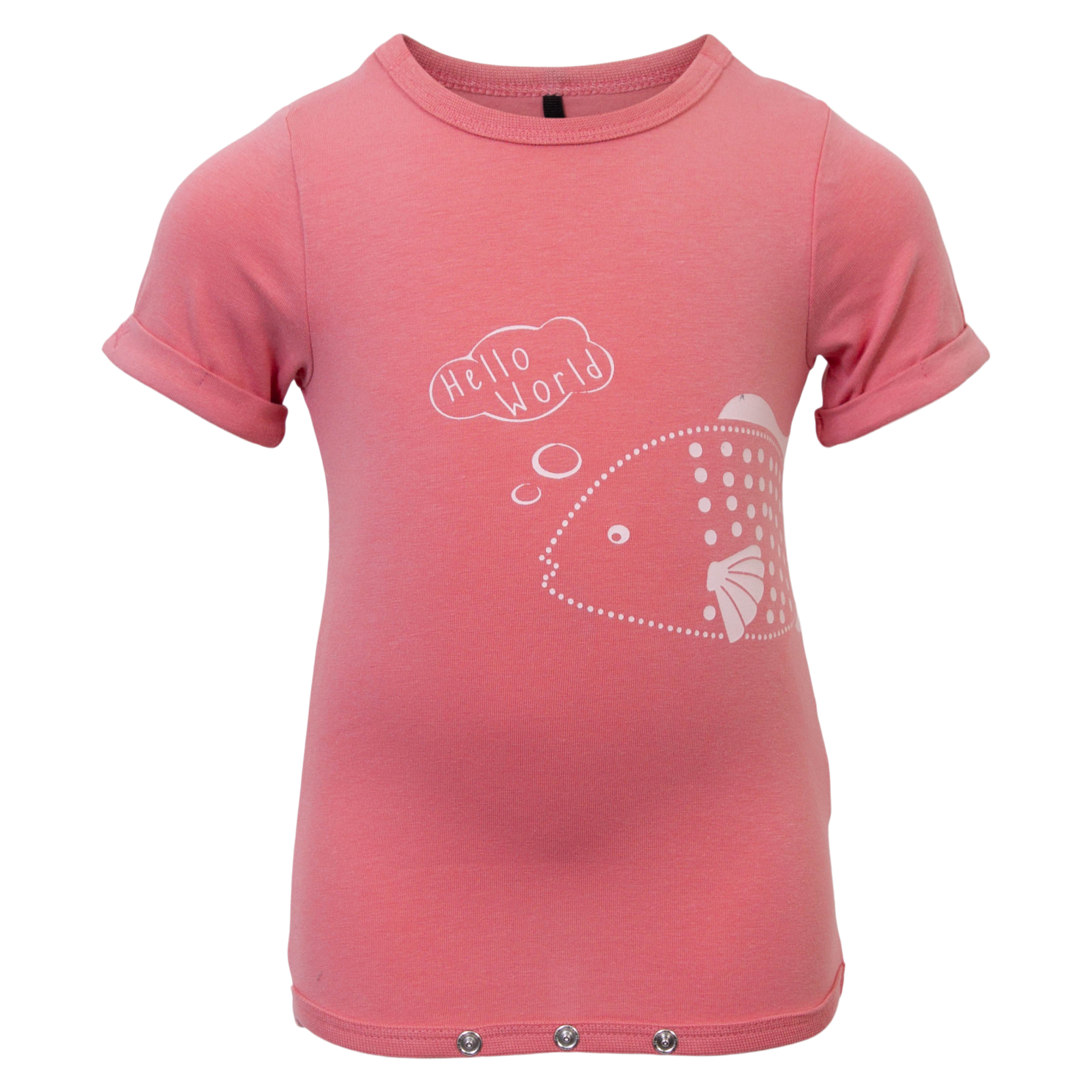 Kortærmet body der lukkes med trykknapper ved skulder og imellem ben. Dragten er lyserød med et print af en stor fisk samt tekstboble Hello world..