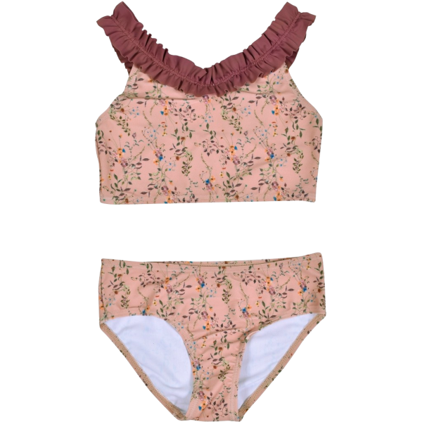 Mikk-line pige bikini. Bikini trusserne har all-over print, samt har de lidt stretch. Bikini toppen har flæse detaljer, samt 2 stropper om skulderne. Sætteter både fleksibelt og hurtigtørrende.