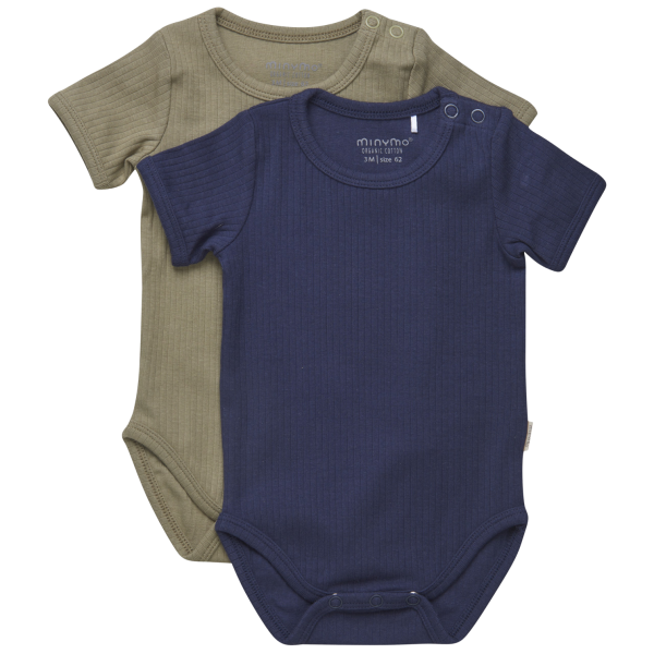 Minymo 2-pack kortærmede baby bodystockings til de små. Pakken består af en body med striber og en ensfarvet bodystocking. Denne bodystocking har to trykknapper ved halsåbningen for nem af – og påklædning, samt 3 trykknapper ved skridtet, så det er let a.