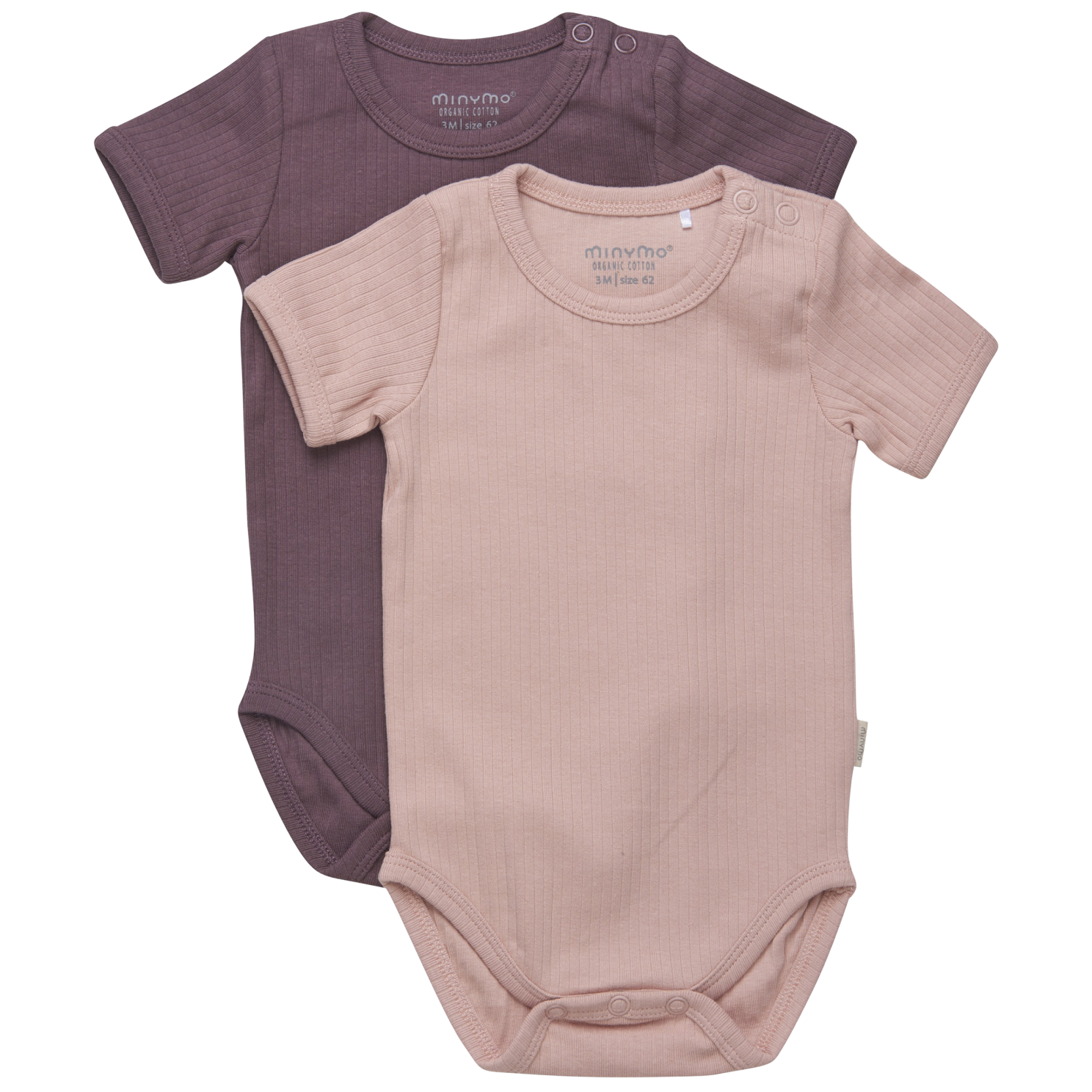 Minymo 2-pack kortærmede baby bodystockings til de små. Pakken består af en body med striber og en ensfarvet bodystocking. Denne bodystocking har to trykknapper ved halsåbningen for nem af – og påklædning, samt 3 trykknapper ved skridtet, så det er let a.